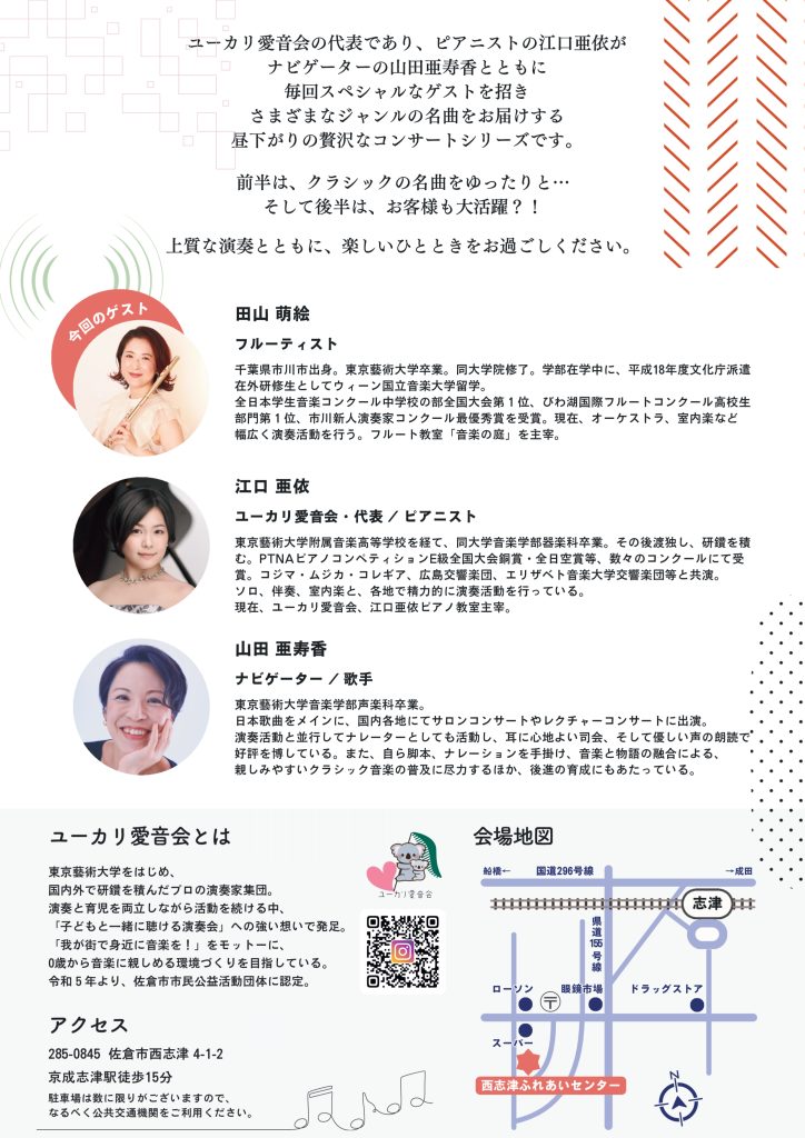 ピアニスト江口亜依(ユーカリ愛音会代表)が、ナビゲーター山田亜寿香(声楽家)と共に、毎回スペシャルなゲストを招き、様々なジャンルの名曲をお届けする、昼下がりの贅沢なコンサートシリーズです。